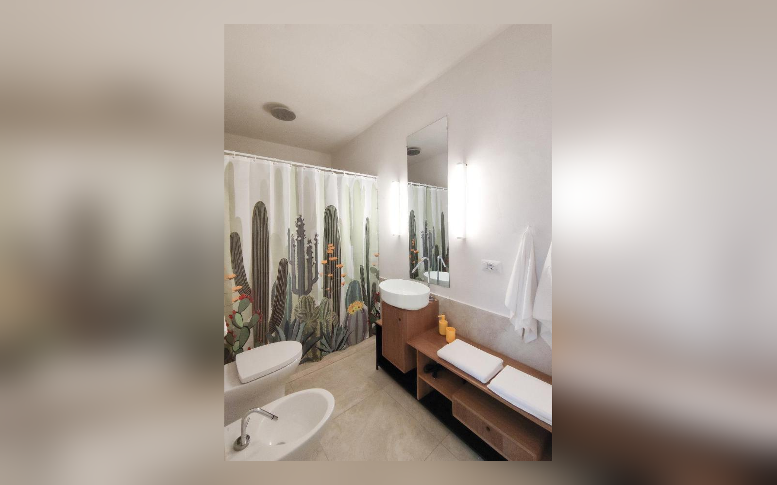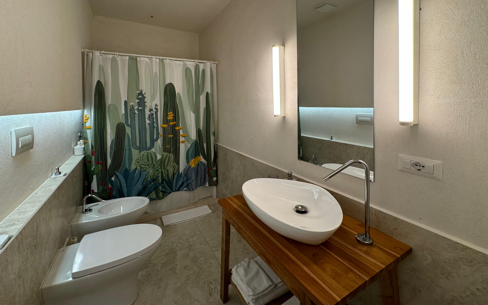Una camera accogliente e luminosa, pensata per coppie o piccoli nuclei familiari. Gli arredi su misura, le tonalità morbide e la grande finestra che illumina l’ambiente creano un’atmosfera rilassante e armoniosa. Il bagno privato è moderno e funzionale, mentre gli spazi generosi favoriscono un soggiorno comodo e piacevole.